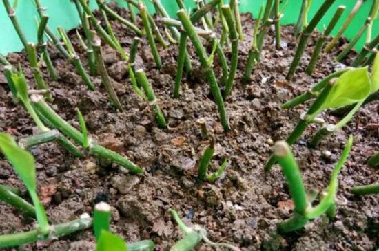 把粗壮的绿萝枝条截取10厘米左右,枝条上面的叶子全部都摘除掉,也可以只保留顶端的嫩叶;把选好的枝条摆在透气的泥沙土中,用淤泥把枝条固定住,在扦插后的一星期,不用进行浇水。