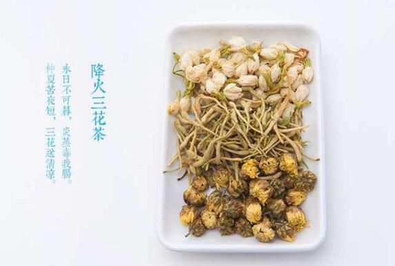 所谓三花茶,就是用三种花跑出来的茶饮,需要的是10克左右的金银花及其菊花,外加3克的茉莉花,最后加入沸水泡茶饮用即可。三花茶有着清热解毒、治疗头痛的功效,用茶水外洗伤口还有着治疗皮炎的作用噢。