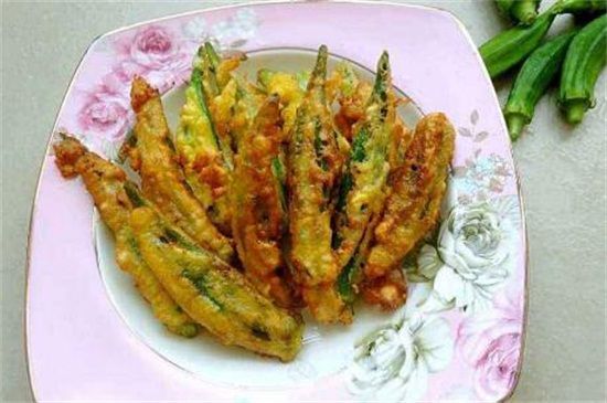 在面粉中加入鸡蛋,调成糊状,将去掉果蒂的秋葵外层包裹一层面糊,锅中油热后下锅煎炸,直到呈乳黄色后起锅,淋上调料后即可食用。