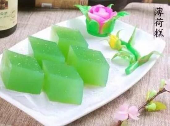 先在煮熟的绿豆中加入少许白糖、桂花和切碎的薄荷叶做成馅;再把糯米焖熟晾凉,把糯米摊平,绿豆薄荷馅放中间包好,在砧板上压扁,切成片片即可。 薄荷糕有祛风散热、清咽利喉的功效。