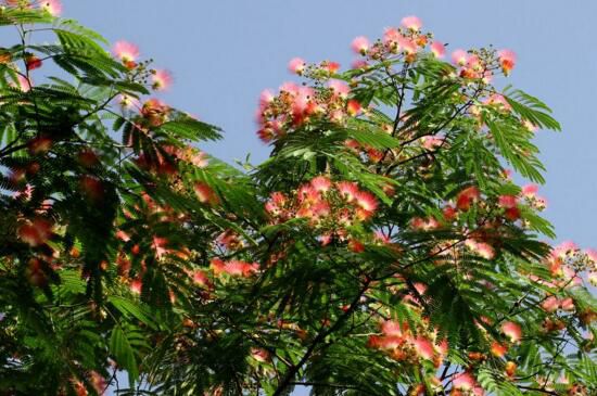 合欢又叫绒花树,喜光耐旱的落叶乔木,通常夏天开花,花朵为粉红色,如丝如缕很是独特。对二氧化硫等有害气体有较强的抗性,多作为行道树栽种。其花朵有强身安神,治疗神经衰弱的功效。
