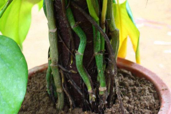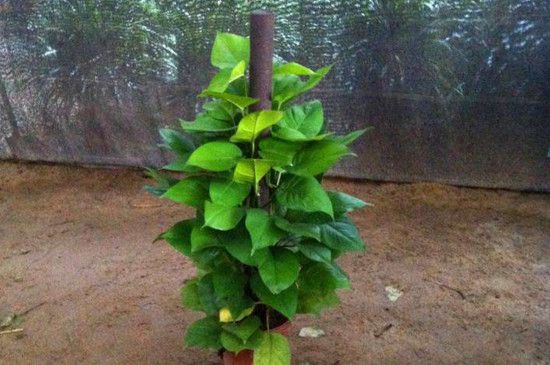 在固定好棕柱之后,就可以进行将绿萝的枝条缠绕在棕柱上了。依据枝条的长度,适度的进行攀扎固定,可以用细绳将枝条绑缚在棕柱上,等到绿萝的气根扎入棕树皮中并固定生长的时候,就可以将细绳去掉了。