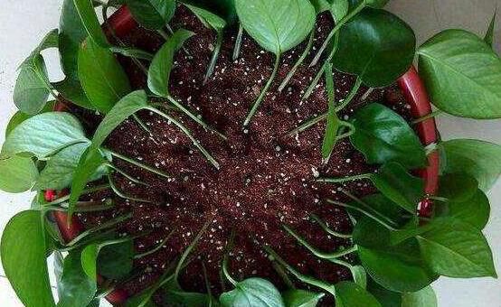 此时已经可以将绿萝插入盆土中了,如果你想要将一根绿萝变成一盆的话,可以将整盆都插满绿萝插穗,但一定要注意技巧。扦插时用绕圈竖插的方式,叶子要朝向花盆外面,由内向外一圈圈的插,插满之后抓一把土薄薄的撒上一层,在喷一些水就行了。