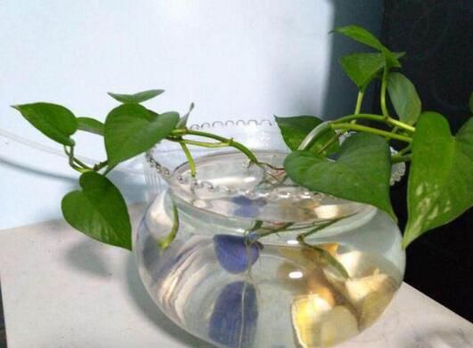 将修建好的绿萝枝条插入准备好的花瓶中,要注意的是枝条底部的叶子不要沾水也不能没入水中,否则在一段时间过后就会腐烂掉,会污染水质的。在还未生根的时候,需要2~3天换一次水,顺便将没入水中的根茎清洗一下,防止烂根。