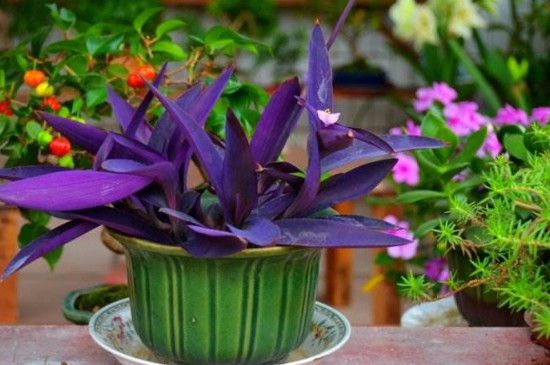 吊竹梅的叶型似竹叶,叶片四散柔垂,凌乱但不失美感 ,它的叶片为紫色,非常适合悬挂进室内观赏养护,花朵为粉红色,喜欢生长在多湿的环境,除日常浇水外,还可向叶片表面喷洒水,可加快枝叶生长。有清热解毒、止血、利尿的功效。