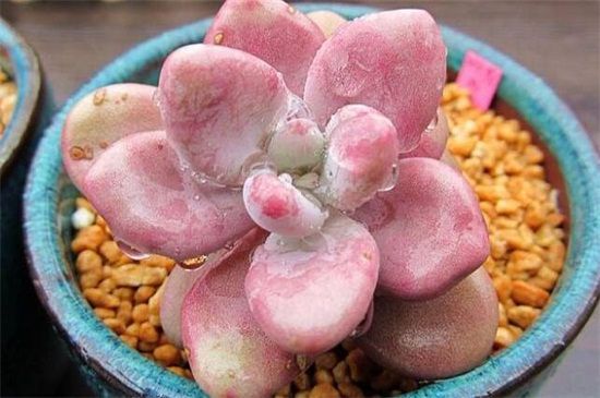 此外也可以通过观看两者的叶片来进行区分,桃之卵的叶片在光照的作用下叶色要比桃美人的鲜艳,叶片会比桃美人的叶片小很多,看起来比较钝圆,而桃美人的叶片先端有凸起的小尖,而桃之卵的叶片没有这种情况。