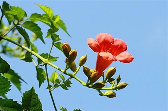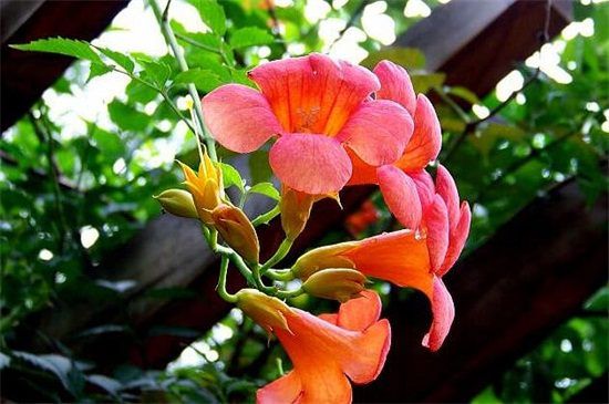 凌霄花的花色鲜艳美丽,它的枝叶常年葱郁繁茂,在生长旺季的时候叶片长得比较密集,在阳光的作用下会释放出量的氧气,还能有效的清除室内的二氧化碳、甲醛等有害气体,起到很好的净化空气的作用。
