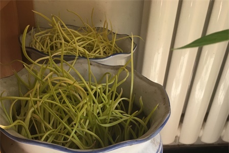 2、土培:准备若干头大蒜,将大蒜放入清水中泡2天,然后将大蒜捞出,放在阴凉通风处沥干水分,让大蒜长根。等大蒜长出新根后把老根剪掉,将大蒜栽入土中,覆盖3cm厚的细沙土,浇透水放入小黑屋,平时保持土壤微潮,等蒜黄长到30-40cm高时就能采收了。