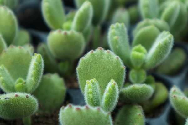 熊童子:颜值靠得住熊童子是相当受欢迎的人气植物,像初生的绒毛小熊脚掌般可爱。阳光充足的话,叶片会变得肥厚饱满。如果过于阴暗,会使茎叶纤细柔弱。