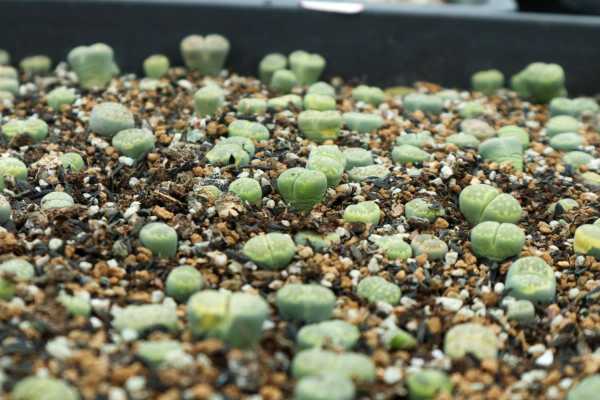 生石花播种繁殖的时间实在四月份到六月份,也就是美妙的春季,因为这时候气候稳定,气温也比较暖了,适合生石花生长,在这个季节播种,成功率比较高。生石花的种子特别小,所以要在种子掉下来之前就要收集好。播种的土壤必须是湿润但没有积水,把种子撒进土里,然后采用浸盆法给种子补充水分,浸盆法就是把带种子的培育盘浸入水中,让水分从培育器皿底部的排气孔从下到上给盆土供养水分,等到土壤表面湿润就可以了。供水做完后,保证生长环境温度在二十度到二十五度之间,大概半个月发芽。发芽后把多余的、不健康的生石花幼苗拔掉,给健康幼苗留下生长空间,等幼苗稍微大一点就可以移栽了。